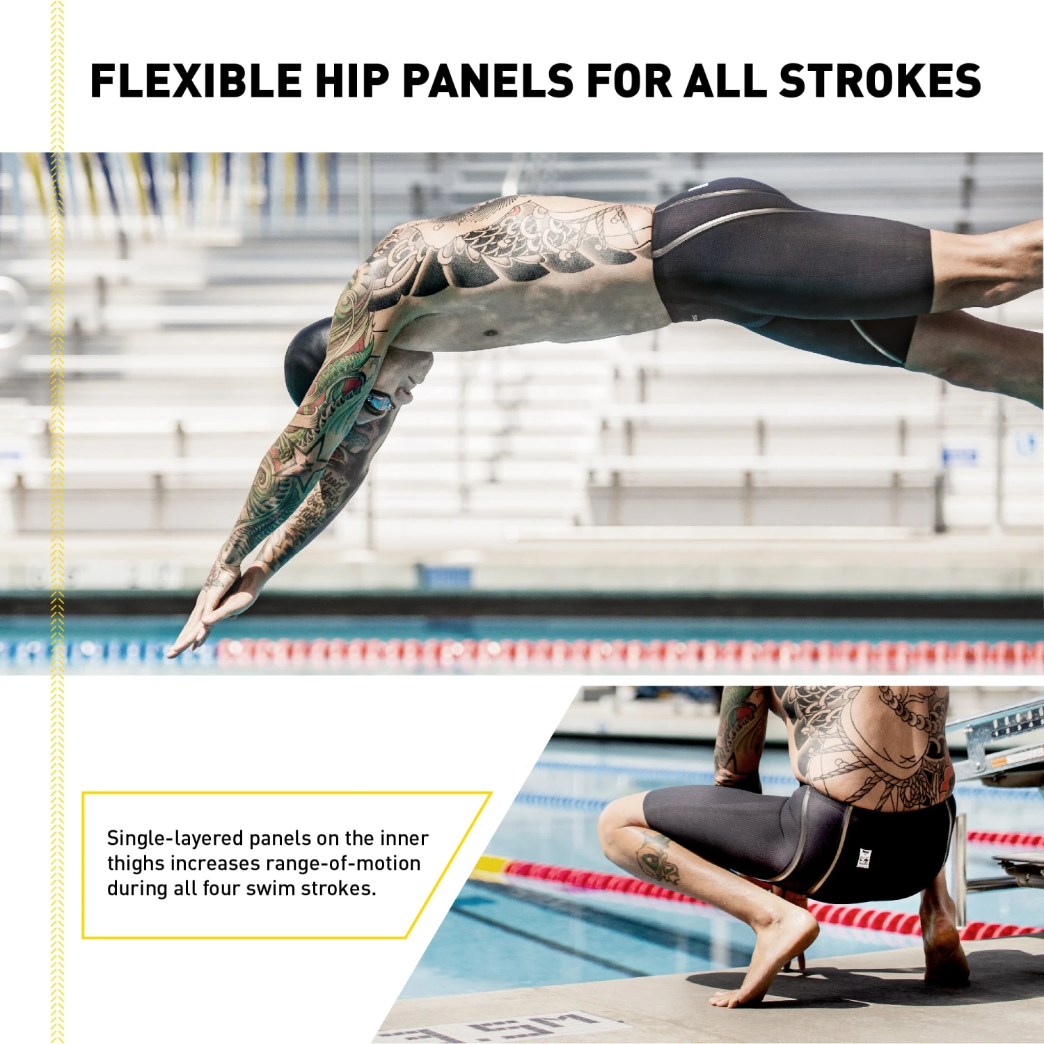 - Lastly, both suits feature single-layered panels on the inner thighs to increase comfort and range of motion in all four swim strokes.