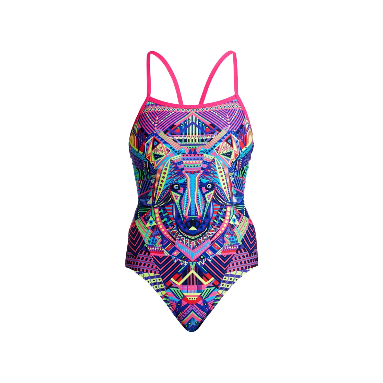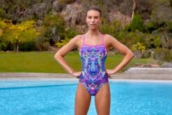 Single strap one piece with strappy V shaped back. Excellent durability and freedom of movement with single bind finish and an open back that will flatter your sporty shape. With full front lining, this is the perfect style for those long hours of training in the pool. Available in sizes 8 – 16.