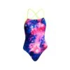The sparkling AMANZI Mermaid Kisses Sports Bikini features a gorgeous cerulean print with sparkling galaxies in pretty pastel pink, emerald, amethyst, and topaz. With a magnolia white seashell pattern over the top, this one piece is easily one of the prettiest prints of the season.