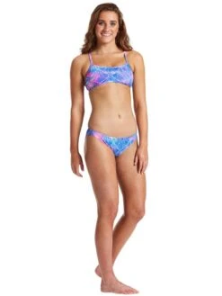 The sparkling AMANZI Mermaid Kisses Sports Bikini Top features a gorgeous cerulean print with sparkling galaxies in pretty pastel pink, emerald, amethyst, and topaz. With a magnolia white seashell pattern over the top, this one piece is easily one of the prettiest prints of the season.